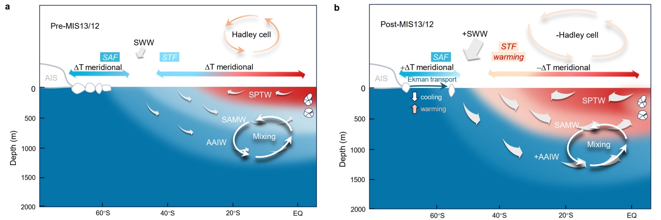 近日,我系早期生命与环境研究团队,联合同济大学、美国、法国等的合作者在国际知名期刊《自然·通讯》Nature Communications发表题为“Equatorward upper-ocean heat transport from the Southern Ocean boosted interglacial warming”(南大洋向赤道的上层海洋热输送促进了间冰期变暖)的研究论文。该研究首次从跨半球上层海洋热量输送的视角,揭示了南大洋来源次表层水体向赤道输送热量在中布容转型后间冰期增暖中的重要作用。