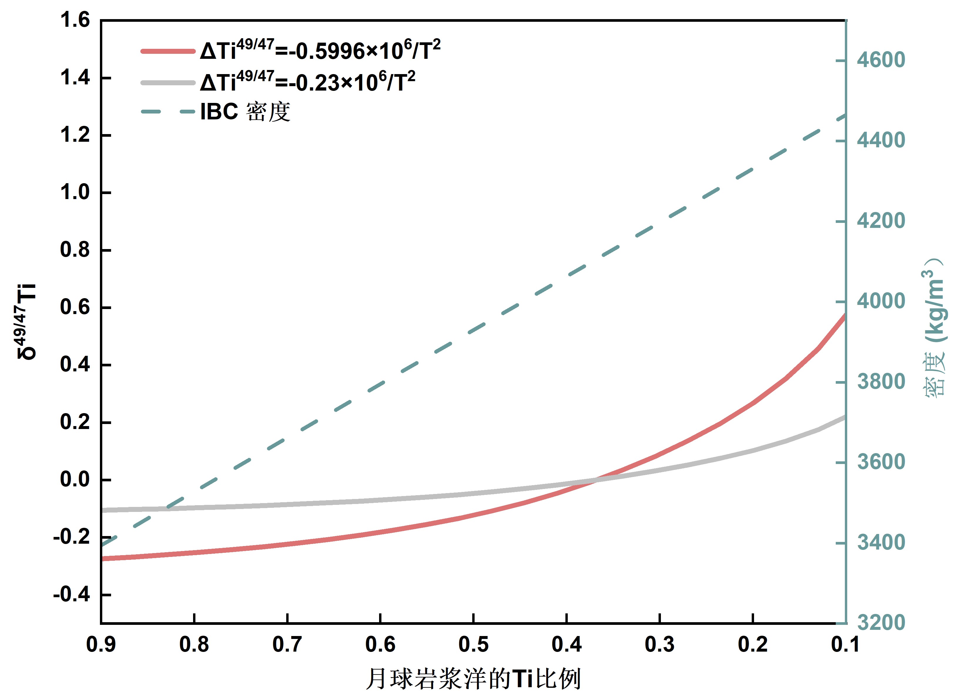 The research team further analyzed the titanium isotope composition of ilmenite and discovered intriguing phenomena. The ilmenite in the CE-5 sample mainly presents two forms: block shaped and needle shaped. The δ 49Ti values of the two are significantly different - block shaped ilmenite (0.01 ‰ -0.18 ‰) is significantly heavier, while needle shaped ilmenite (-0.09 ‰ -0.04 ‰) is relatively lighter (Figure 3). The model shows that in the late stage of lunar magma sea, as ilmenite continues to accumulate, the overall density and δ 49Ti of the crystal layer will gradually increase (Figure 4). These 'heavier and denser' late IBCs are more prone to gravity overturning and sinking into the lunar mantle. Therefore, the heavy isotope signals in the blocky ilmenite are likely to record the process of these late stage sinking IBCs re participating in melting and mixing into the source area.
