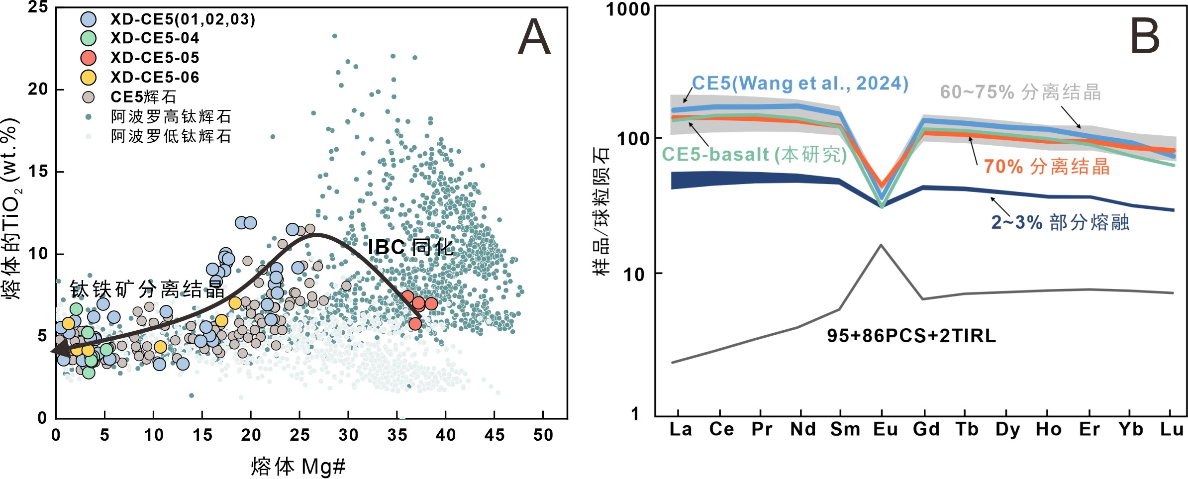 . Usually, 86 PCS (percentage crystallized solid: solidification ratio) represents the composition of clinopyroxene, and 95 PCS represents the composition of ilmenite. Further simulation of the rare earth element characteristics of magnesium rich pyroxene (Mg #>60) shows that the CE-5 parent magma can be generated from a mixed source area of clinopyroxene and ilmenite (86 PCS+95 PCS), and undergoes 2-3% partial melting and about 70% fractional crystallization formation (Figure 2B), providing independent evidence for IBC involvement.