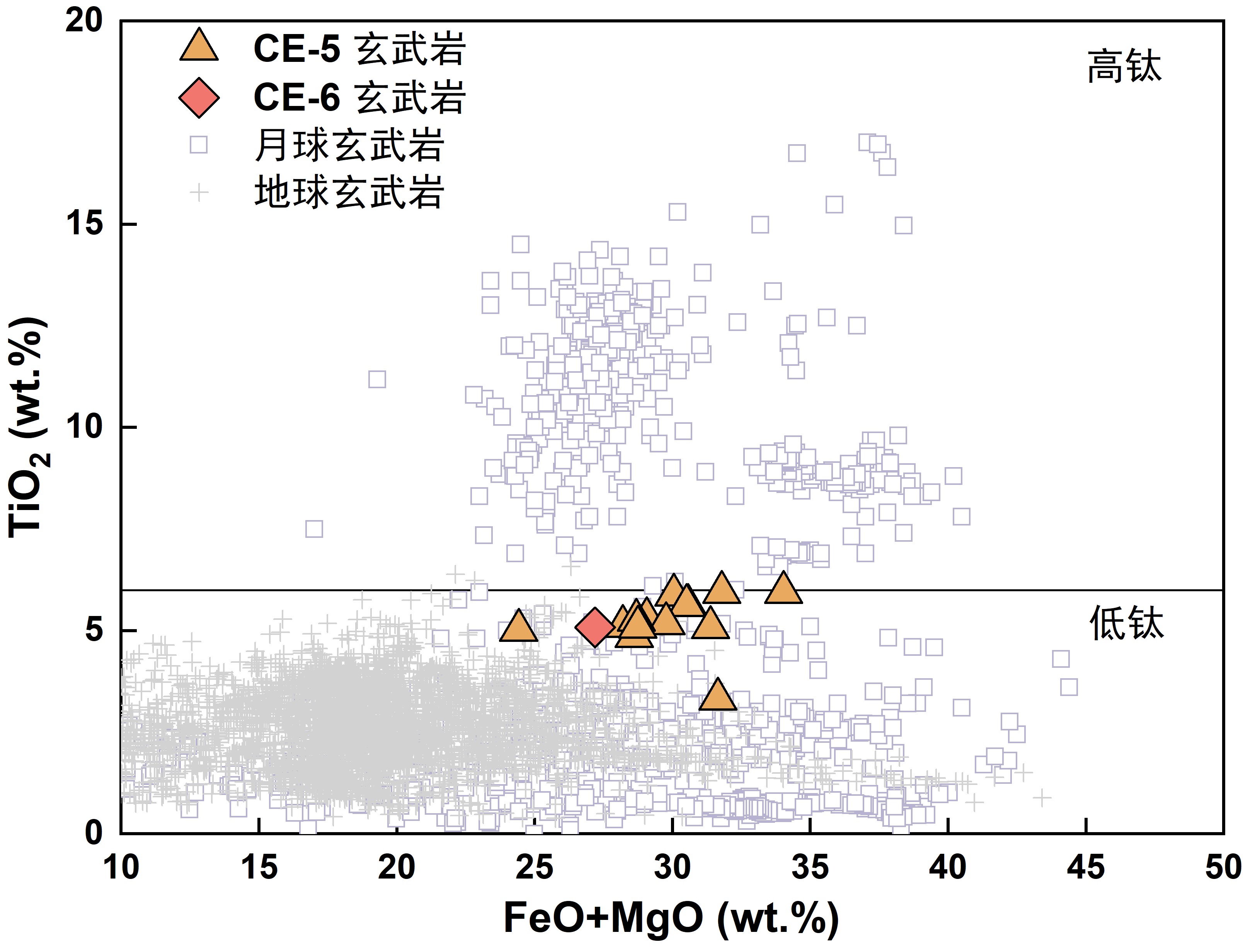 Chang'e-5 Basalt: The "Titanium Ore Code" Hidden Deep in the Moon. Basalt is a rock formed by volcanic eruptions and a "window" for studying the internal structure and activity of planets. Compared with Earth basalt, lunar basalt has a significant characteristic - the titanium content varies greatly, from less than 1% wt.% to over 15% wt.%, reflecting significant chemical heterogeneity in the lunar mantle. It is usually divided into two categories based on this: "low titanium type" and "high titanium type". It is noteworthy that the Ti content of the basalt returned by Chang'e-5 (CE-5) is between the two, located in the transition zone between high titanium and low titanium basalt, and is considered a key sample for understanding the evolution process of the lunar mantle (Figure 1).