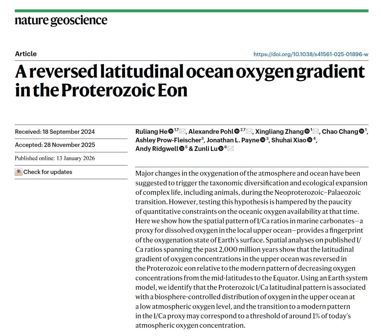 近日,西北大学早期生命与环境研究团队在《自然·地球科学》(Nature Geoscience)发表了以“A reversed latitudinal ocean oxygen gradient in the Proterozoic Eon”为题的研究论文。该研究通过分析过去20亿年以来I/Ca地球化学指标的古纬度分布,发现了元古宙海洋的氧气含量由赤道附近向中高纬度降低,氧气分布受产氧光合作用主导,为“氧气绿洲”式氧化模型;而显生宙海洋的氧气含量由赤道附近向中高纬度增加,氧气分布受海水温度与有机质再矿化作用主导,为类似现代的纬度控制式氧化模型。海洋氧化模型的转换与元古宙和显生宙之交的大气氧化过程相关,为研究6亿至5亿年前海洋生物的快速辐射与演化提供了重要古环境背景。