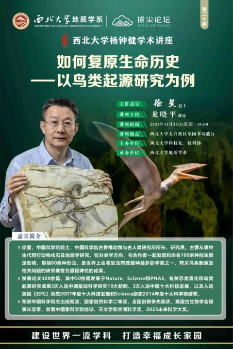 11月24日,由地质学系主办的“拔尖论坛”第二十讲暨“西北大学杨钟健学术讲座”系列活动在西北大学太白校区萃园报告厅举行。中国科学院院士徐星研究员,应邀为我系师生作了题为“如何复原生命历史-以鸟类起源研究为例”的报告。学校相关部门负责人和师生代表听取了报告。