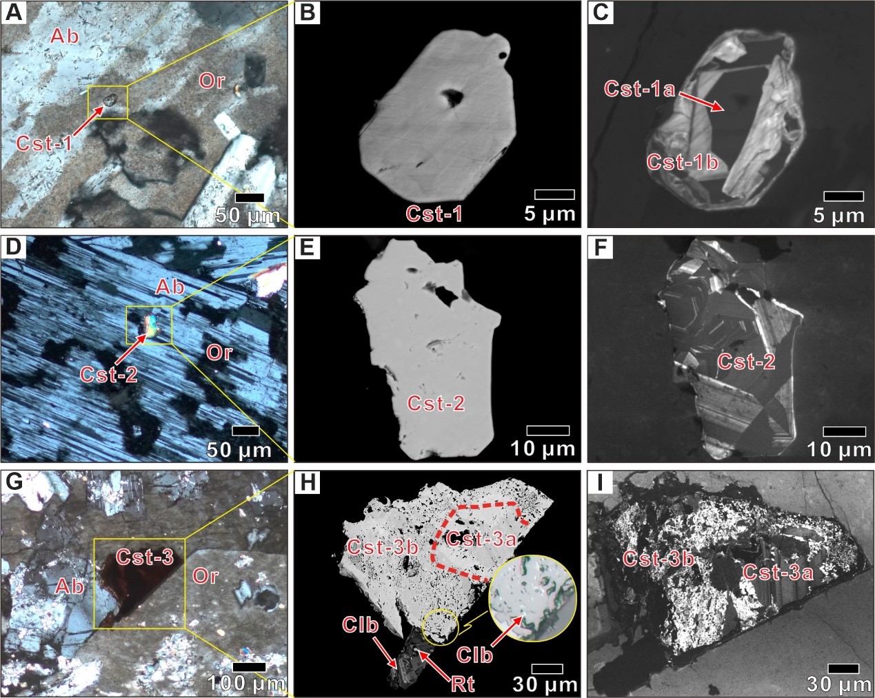 图 2. (A-C)花岗斑岩中锡石显微照片、BSE图像和CL图像;(D-F)钾长石巨晶细粒黑云母花岗岩中锡石的显微照片、BSE图像和CL图像;(G-I)细粒黑云母花岗岩中锡石的显微照片、BSE图像和CL图像