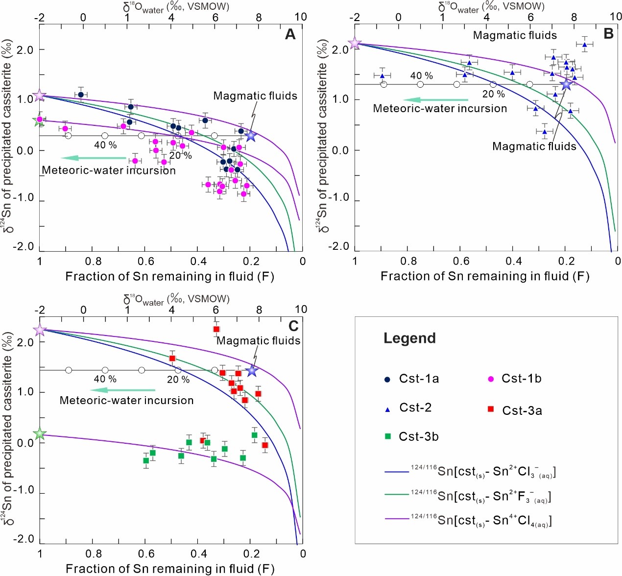 图 4. 锡石从含不同锡络合物的流体中沉淀时,锡同位素(δ124Sn)演化的瑞利分馏模型,以及不同锡石的δ124Sn与对应的平衡流体的δ18O的关系。Cst-1a、Cst-2和Cst-3a中的δ124Sn与δ18Owater呈负相关,表明每组流体中锡石形成都是由于低δ18O值的大气水的加入