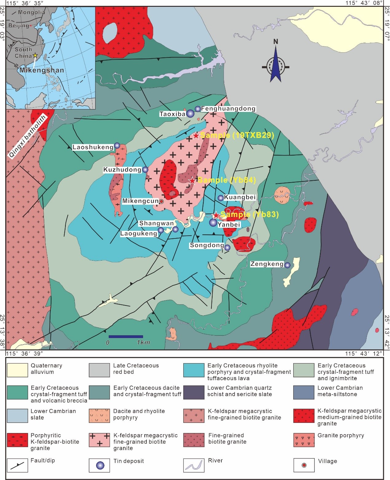 针对这一科学问题,西北大学地质学系刘鹏教授与包志安高级工程师、袁洪林教授合作,在国内率先开发了锡石高精度原位锡同位素分析方法(Zhang et al., 2023),并在毛景文院士指导下,联合国外多个锡矿研究团队开展了系统研究。该研究基于前期在我国华南密坑山锡矿区(图1)复式岩体中发现的不同类型锡石,开展了锡石微观特征、微量元素、氧同位素和锡同位素研究,取得了以下重要认识: