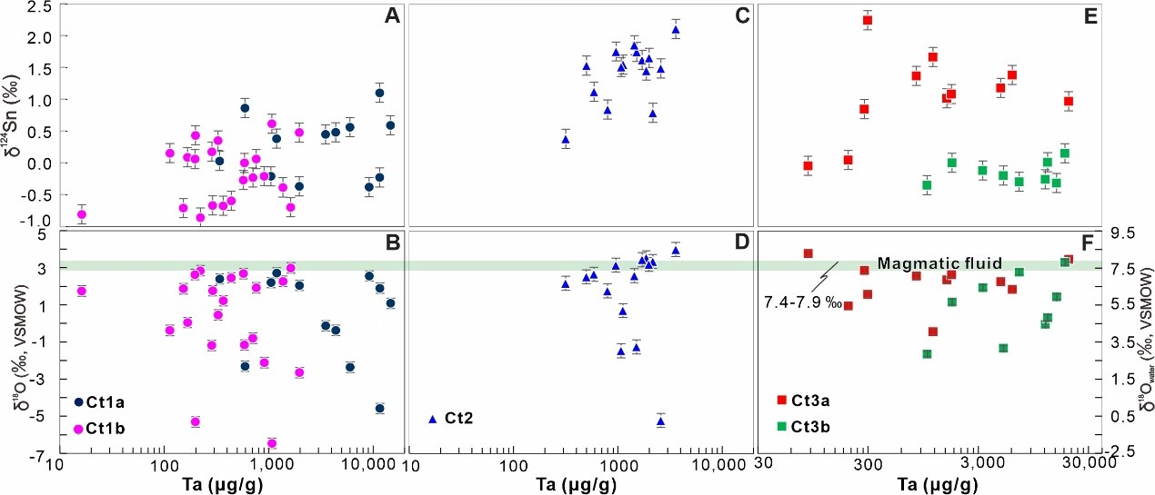 (1)在复式花岗岩体中识别出不同类型的锡石,并根据阴极发光(CL)图像进一步划分为五个亚类(图2)。这些锡石具有高且不均一的Ta含量和变化的Sn–O同位素组成,揭示其形成于岩浆演化晚期至岩浆期后阶段,是岩浆演化晚期流体参与形成的(图3)。