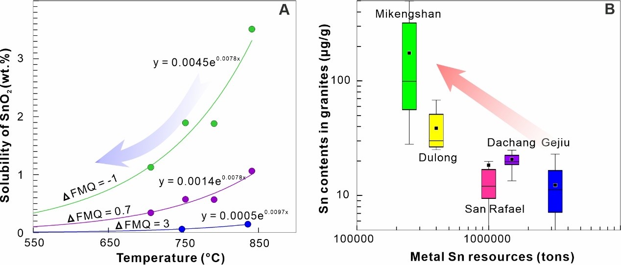 图 5.(A)不同氧逸度下SnO2溶解度与温度的关系;(B)不同规模锡矿锡资源量与成矿有关花岗岩锡含量的关系