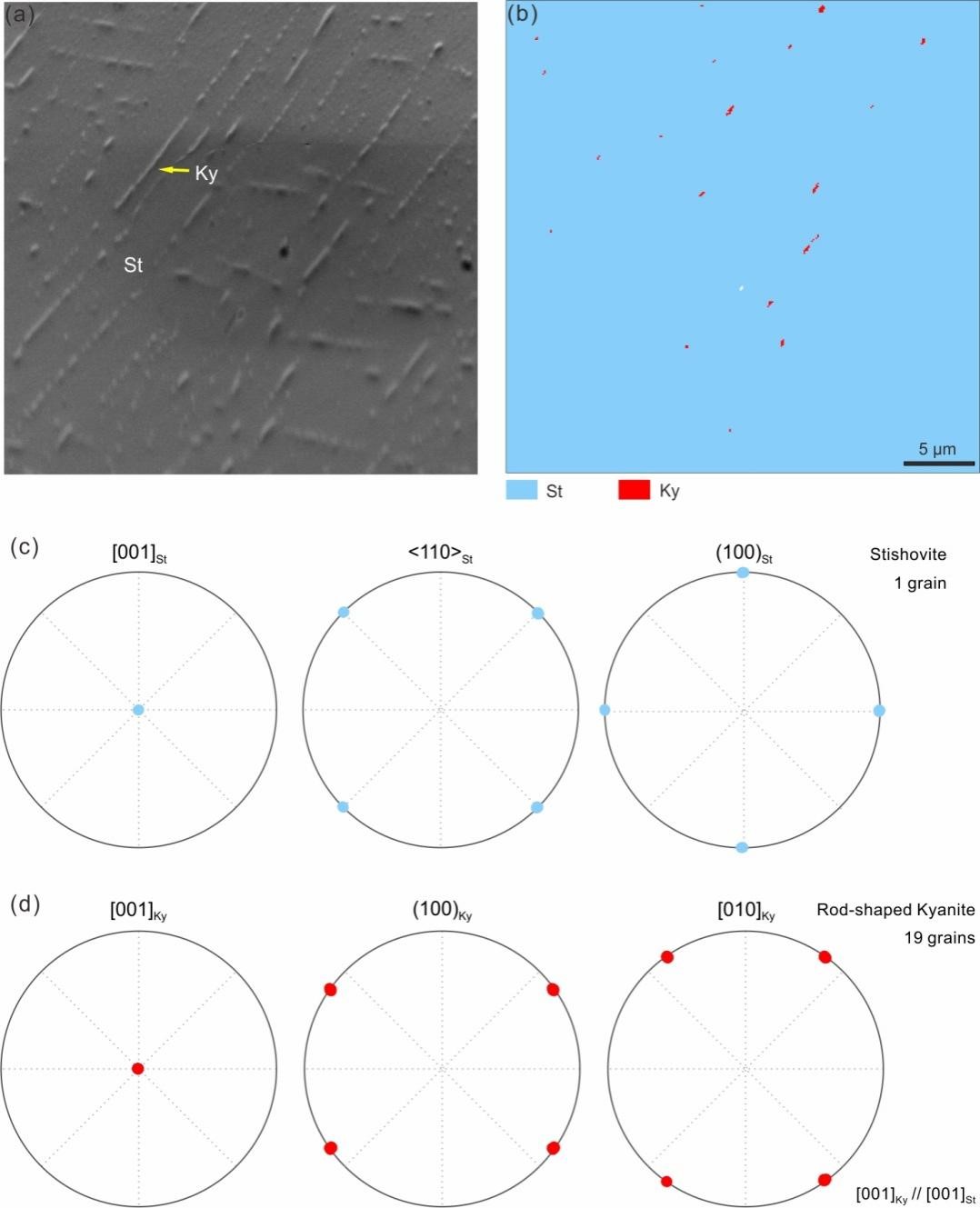(3)当降压降温穿过斯石英与柯石英转变线(9 GPa和1200 ℃)时,在远离电热偶的低温端可见斯石英与柯石英共存(图2b)。斯石英内部出溶的蓝晶石棒状体与柯石英中继承的蓝晶石棒状体在延长方向上连续且平行,进一步证实柯石英不仅继承了先期斯石英出溶的蓝晶石,而且这些蓝晶石出溶体仍然保留了早期斯石英出溶时的晶体取向(图2c);