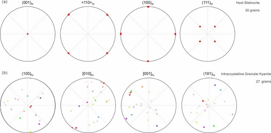 (2)溶解于斯石英中的铝以蓝晶石的形式分两个阶段完全出溶:第一阶段发生于斯石英稳定域内,伴随温压降低逐渐出溶;第二阶段发生于斯石英转变为柯石英期间,表现为一个“突变”的出溶过程;