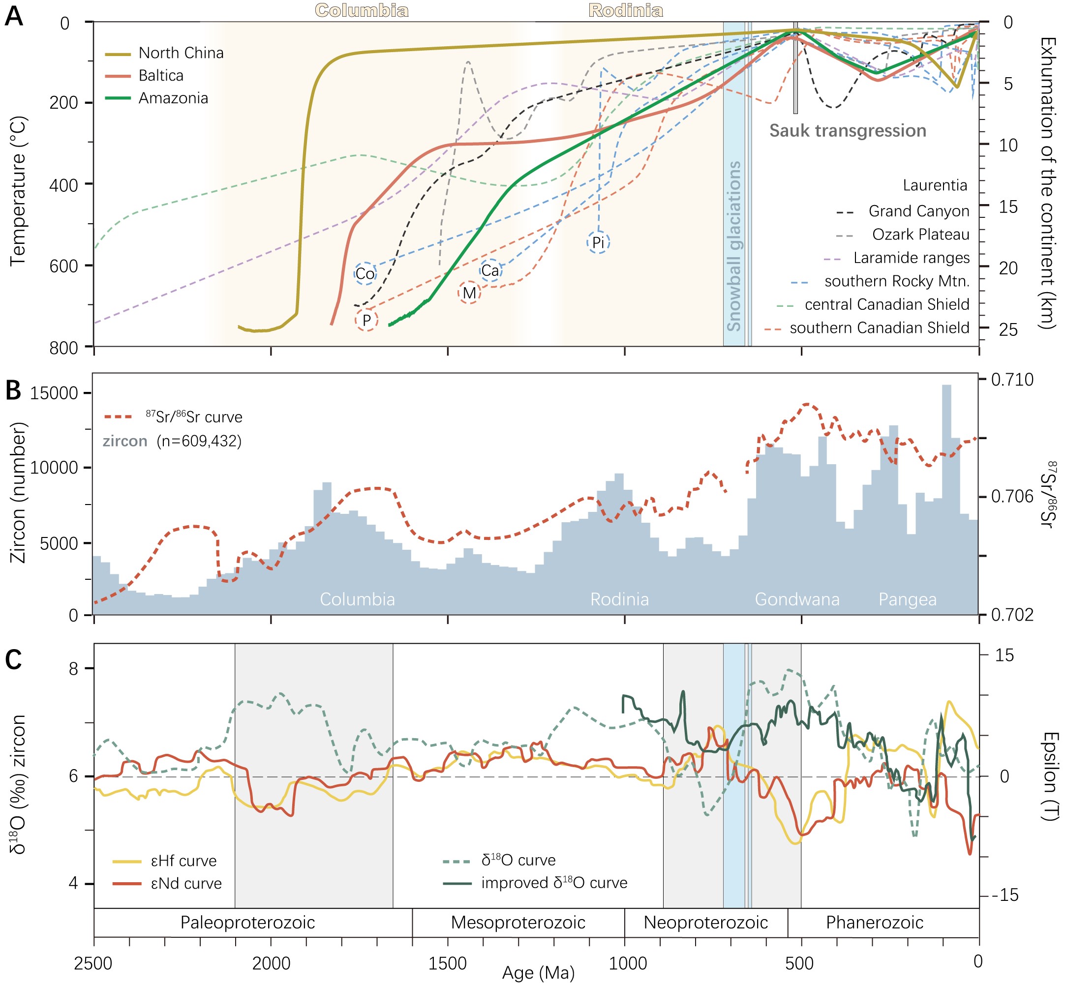 图2 地球系统演化背景下全球典型克拉通基底冷却和剥露历史。华北、波罗的、亚马逊和劳伦古陆内部基底从中-上地壳至近地表的冷却历史(A);全球碎屑锆石年龄分布和海水 87Sr/86Sr同位素(B)以及锆石O-Hf同位素和全岩Nd同位素曲线(C)显示大陆风化强度的显著升高同步发生在距今21至16亿年的哥伦比亚超大陆聚合期间。