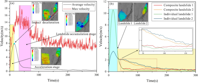 研究还发现,滑坡体的厚度显著影响其运动模式:厚度较大的滑坡体(坡1)表现为后缘推动前缘的整体滑动模式,而厚度较小的滑坡体(坡2)则表现为前缘牵引后缘的拉伸滑动模式。两种模式的差异导致了两者在碰撞后的不同响应特征(图7)。