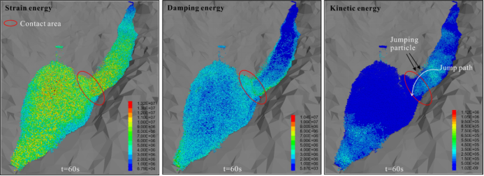 通过能量分析表明,滑坡体碰撞过程中,约2/3的动能转化为应变能储存在接触带内,1/3转化为阻尼能消耗(图5)。这种能量分配机制使得碰撞后的滑坡体不会发生剧烈抛射,而是以“软碰撞”形式缓慢融合,有利于后续泥石流的形成(图6)。