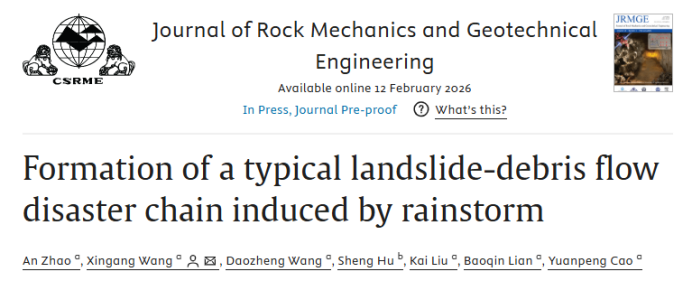 论文信息:Zhao A, Wang X*, Wang D, Hu S, Liu K, Lian B, Cao Y, (2026).Formation of a typical landslide-debris flow disaster chain induced by rainstorm, Journal of Rock Mechanics and Geotechnical Engineering.