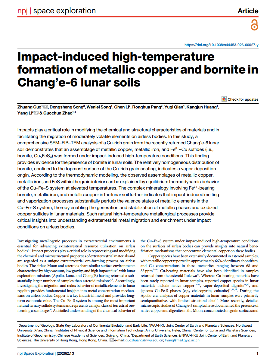 Guo, Z., Song, D., Song, W. et al. Impact-induced high-temperature formation of metallic copper and bornite in Chang’e-6 lunar soils. npj Space Exploration. 2, 13 (2026). https://doi.org/10.1038/s44453-026-00027-y