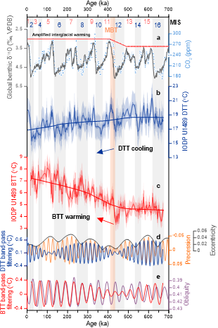 图 1 | IODP U1489 站位次表层海水温度记录,及其与轨道参数和大气 CO2 浓度的对比。