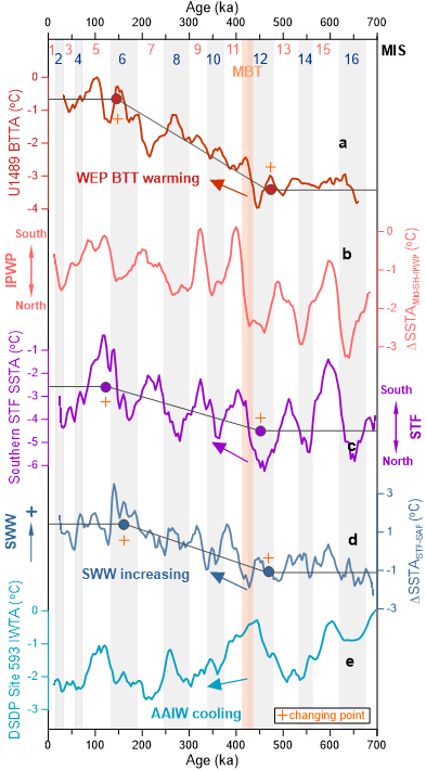 然而,驱动中布容转型的机制,长期以来是古气候学的一个难题。针对该气候转型,传统研究多关注深海大洋环流重组、海洋生物碳泵效率、海洋-大气碳循环等过程,但截至目前并未充分解答“中布容转型”之后间冰期显著增暖的原因。近年的研究进展表明:海洋内部热量在十年际、轨道尺度乃至百万年尺度上都可以发生显著变化,并直接产生气候效应。尤其是上层海洋,与大气互动最密切、对全球变暖响应,通过大洋浅层翻转环流调控着跨半球的热量传输。然而,类似“中布容转型”这样的古气候演变重大事件中,海洋内部的热量如何重新组织,仍然鲜有深入研究。