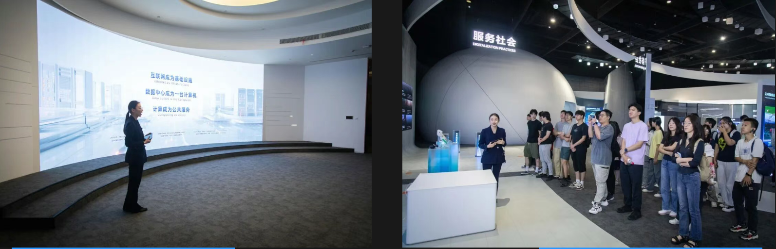 在阿里云科技展厅内,讲解人员就“互联网成为基础设施”“数据中心成为一台计算机”以及“计算成为公共服务”三个方面,为西北大学的学子们进行了详尽而生动的讲解。通过VR演示和智能语音助手等互动技术,讲解员向同学们全方位展示了阿里云在智慧城市、云计算、大数据等领域的前沿创新成果。从“飞天”分布式操作系统到“通义千问”大模型,同学们不仅亲眼见证了这些尖端技术的实际应用,更深刻感受到了中国科技企业的强大实力与创新能力。
