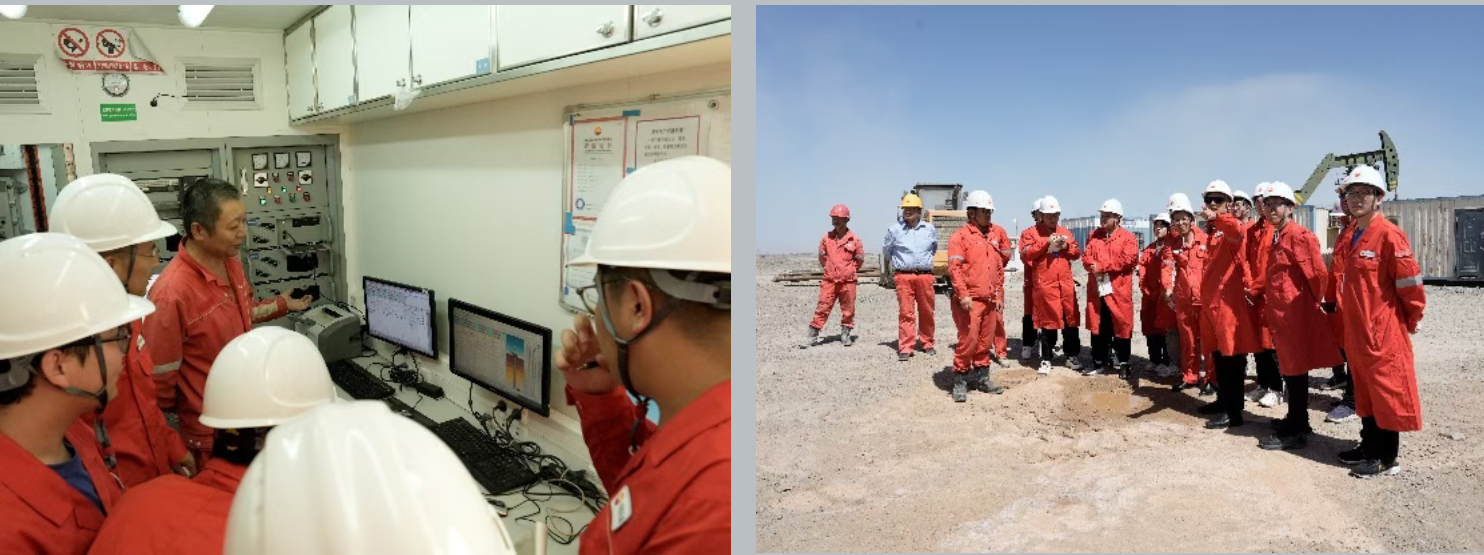 在吐哈油田三塘湖采油区,钻机的轰鸣声与抽油机的律动构成了一幅工业脉搏的生动图景。我系师生走进作业核心区,近距离观察智能化钻井平台的运行过程。油田工作人员以现场设备为教具,系统解析了原油从地质形成→运移富集→开采提输的全链条流程。师生们通过多维度互动与现场工作人员深入交流,本次现场学习以“井场为课堂、岩心为教材、数据为语言”,推动专业认知认知实现了技术认知升维、学科交叉实践和能源使命淬炼的三重跨越。这种 “产学研用” 深度融合的实践模式,正是创新人才培养机制、对接西部大开发能源产业需求的生动实践。