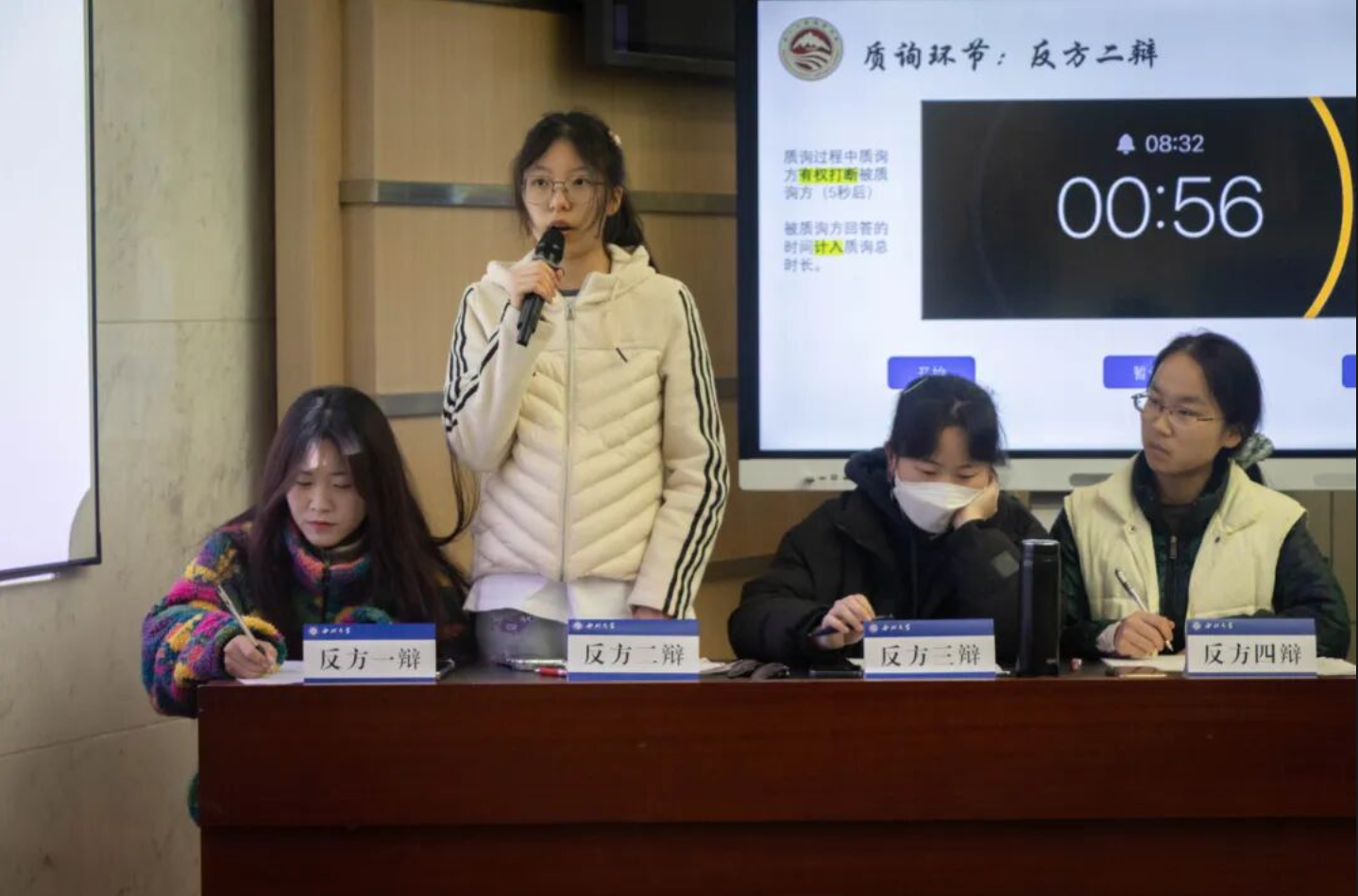 在复赛的攻辩环节中,6队与4队就“大学宿舍矛盾调解应优先保障集体秩序还是个体自由?”展开激烈辩论。