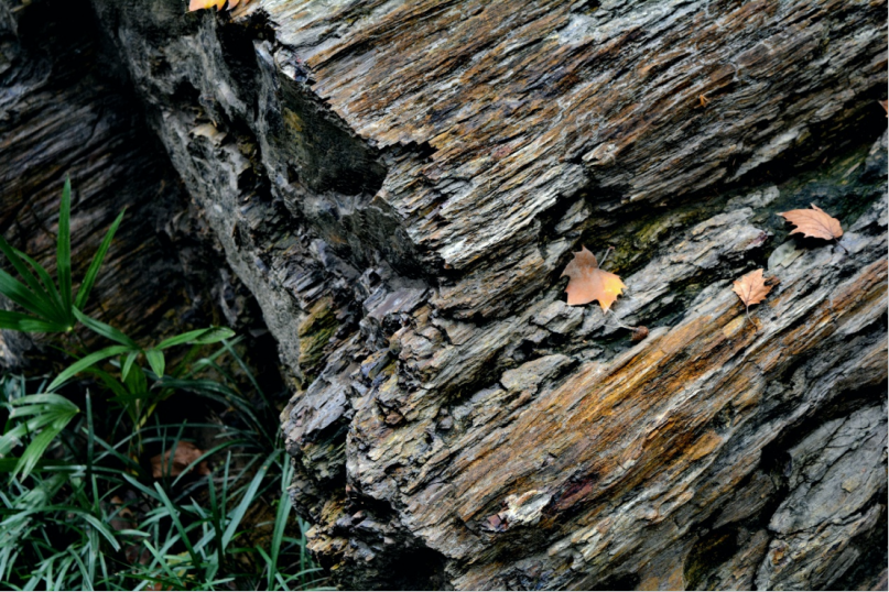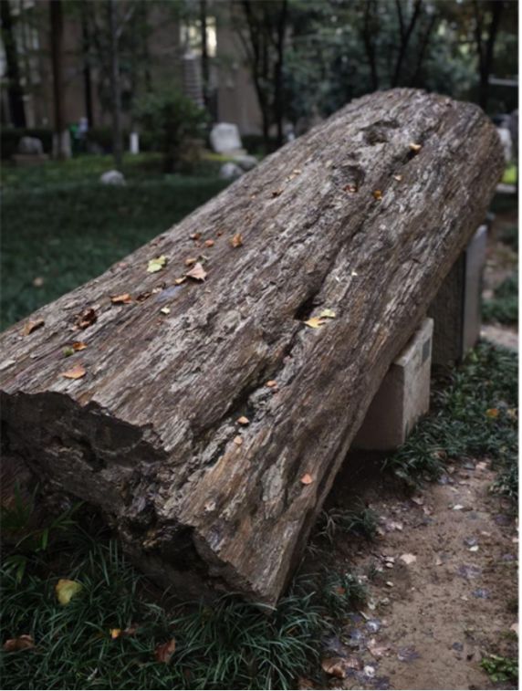 硅化木承载着地质年代的磅礴叙事,其上飘零的落叶则诉说着季节轮回的瞬时之美。石质脉络中细腻的肌理与落叶轻薄的叶脉形成质感对话;矿物形成的暖褐色调与秋叶自然的锈红相互唱和。这片偶然停驻的落叶,仿佛时间信使,在永恒与须臾之间架起了一座视觉的桥梁。