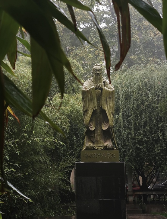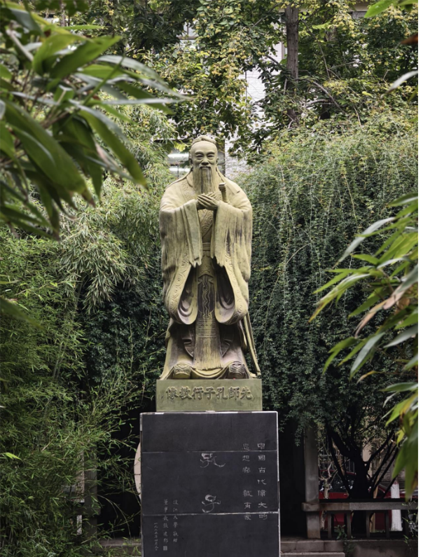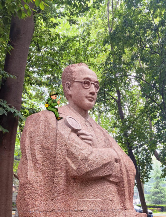 矗立在地质学系楼前的雕塑,面朝系楼,背靠郁郁葱葱的树林,既体现了杨钟健教授对西北大学地质学系学生的关怀之情,又以树木之葱郁展现他在教学成果上的丰功伟绩。手持的放大镜也表明了他对地质学的热爱与奉献。