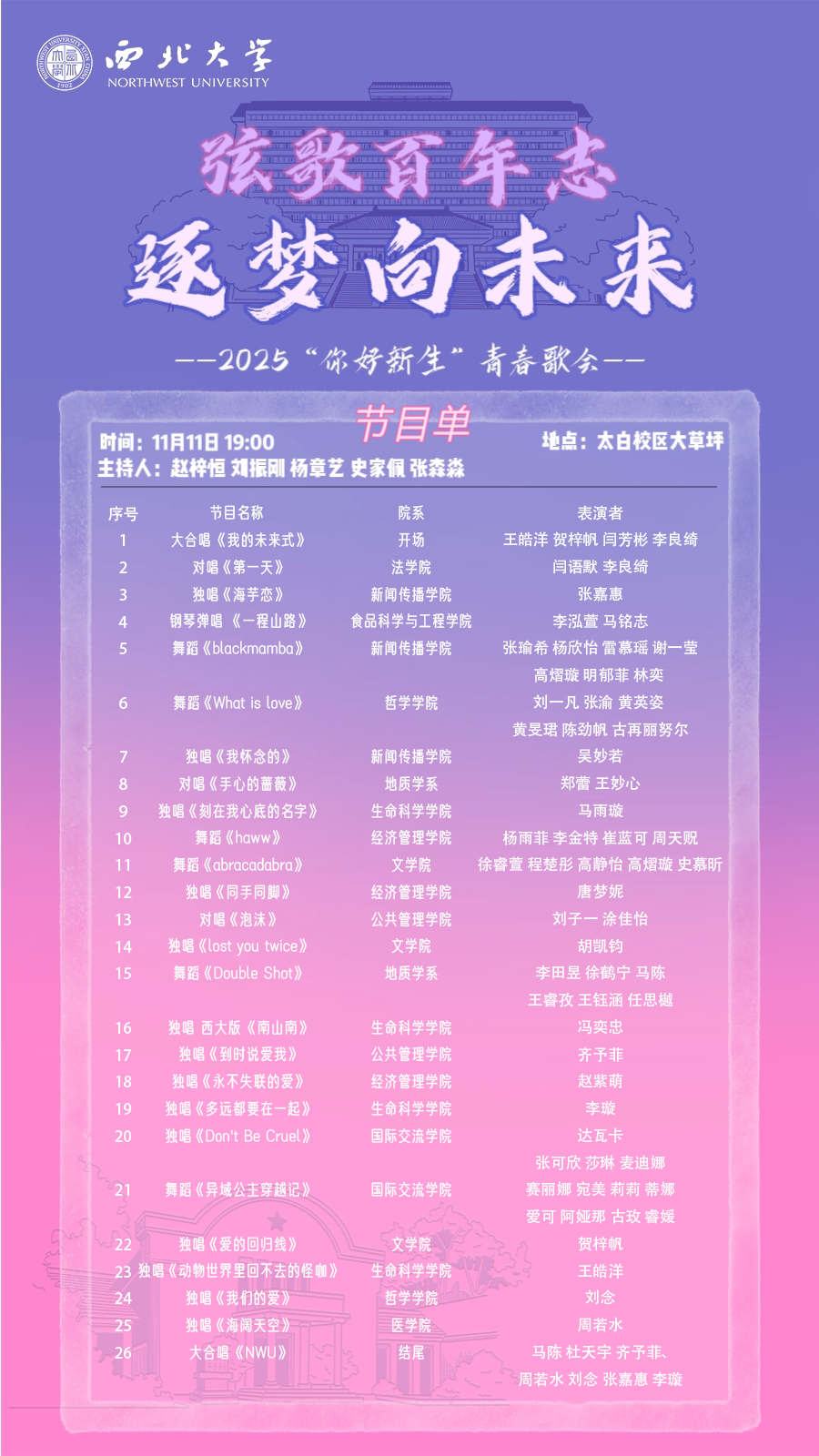 昨晚的青春歌会,仿佛是一封流动的情书。暮色笼罩着草坪,台上歌声接连响起,舞姿灵动摇曳。从《我的未来式》到《NWU》用属于西大的旋律,划开沉静的夜晚;从《blackmamba》到《Double Shot》用属于西大的动作,点燃沸腾的青春。点点荧光连成流动的星河,掌声与跟唱声在夏夜里回响。西大新生们,跟着同一段旋律轻轻晃动。没有拘束,只有真挚的喜欢与心灵的共振。这不只是一场演出,更是西大人共同凝住的时间,让年轻的温度,永远留在音乐的节拍里,留在西大的校园里!
