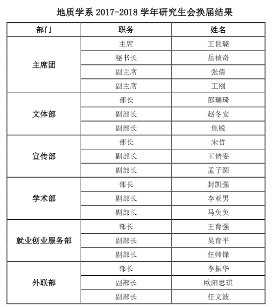 根据《西北大学地质学系研究生代表大会制度》和《西北大学地质学系研究生会章程》等文件精神,经个人申请、竞选,地质学系团委审核,王世璐等19名同学组成新一届研究生会,现予以公示。公示期内,广大师生若有异议,请于6月21日下午四点之前通过电话、信件、电子邮件等方式实名向系团委或系党委反映。