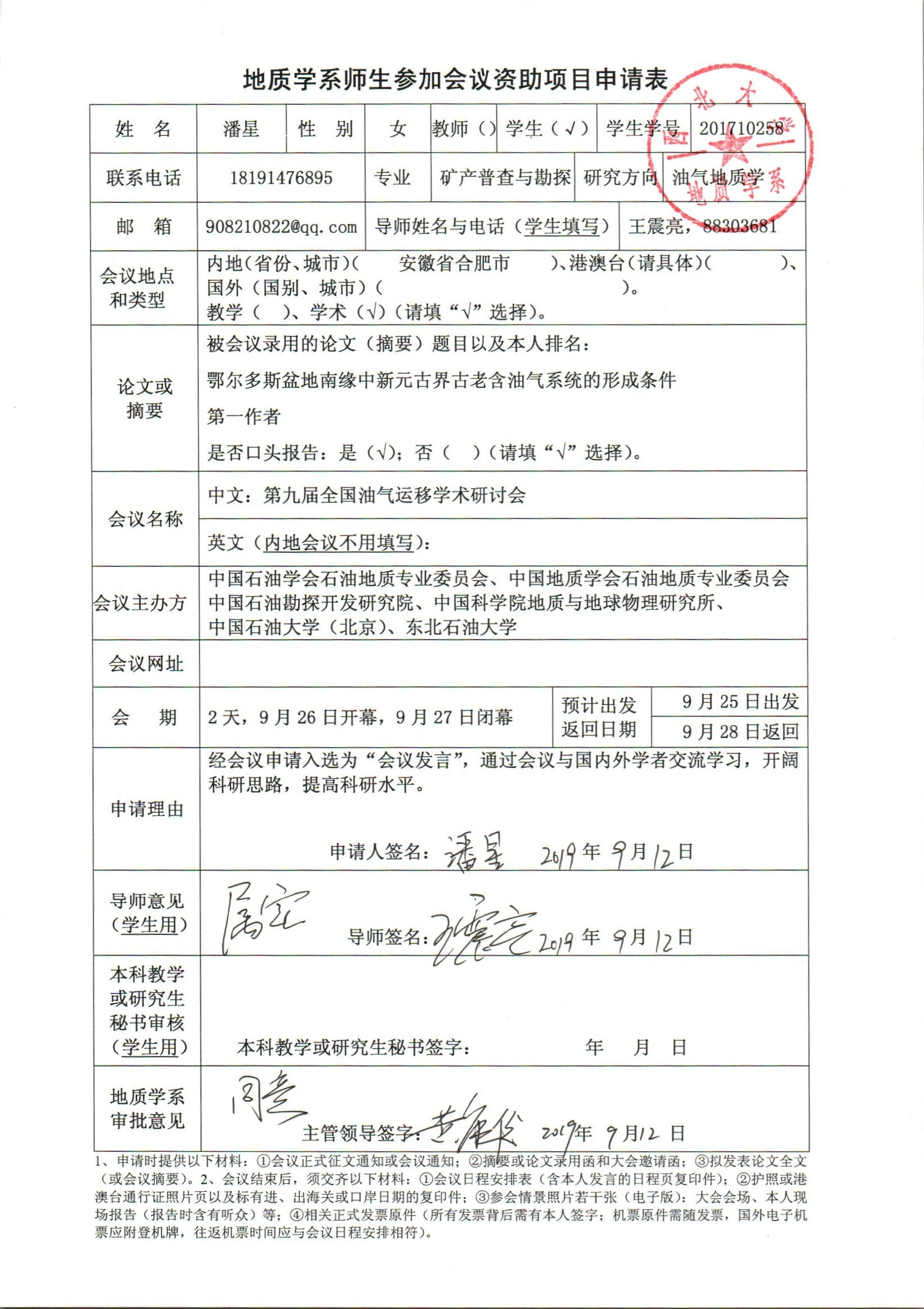 地质学系关于资助研究生潘星等5人出国参加学术会议的公示