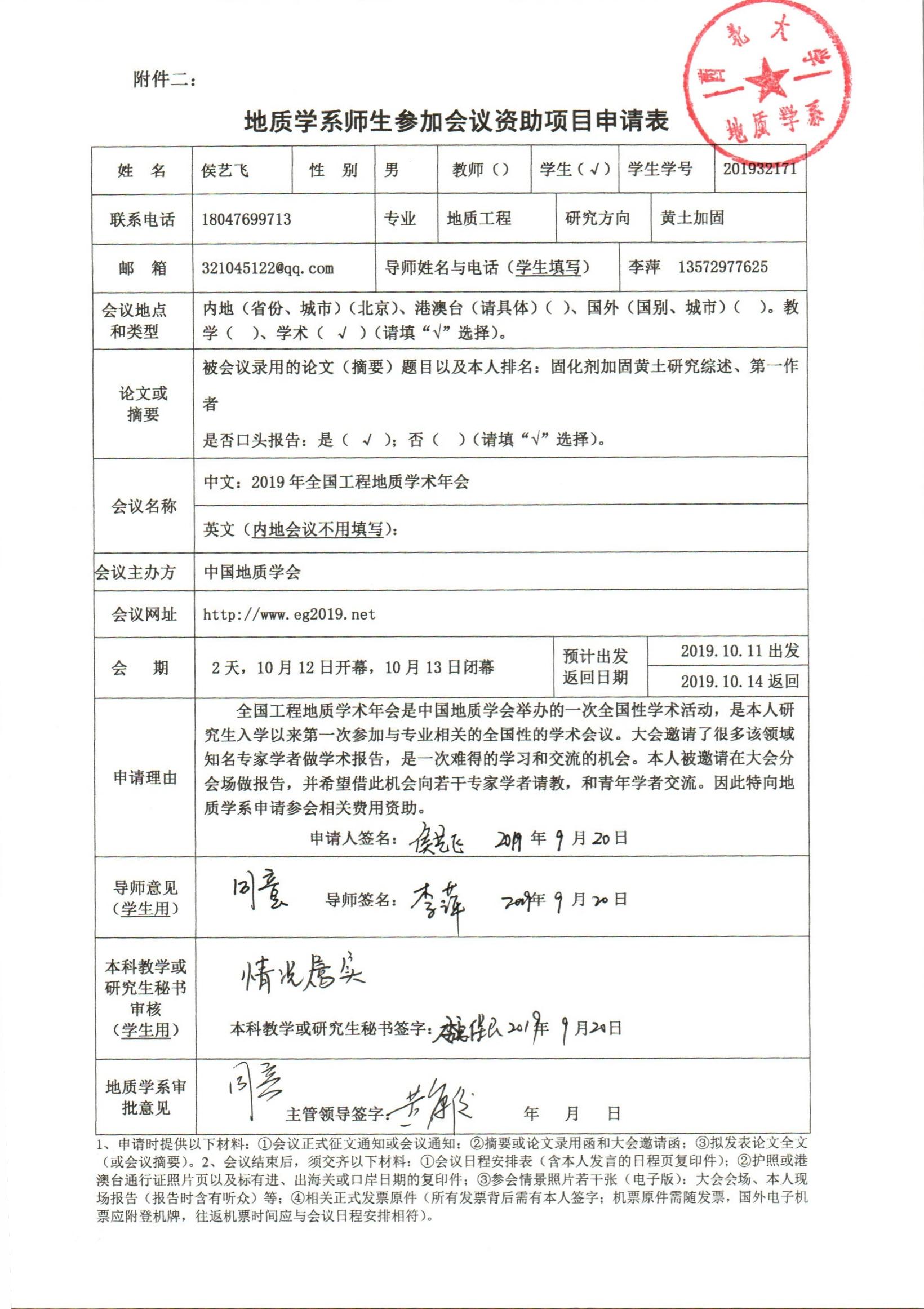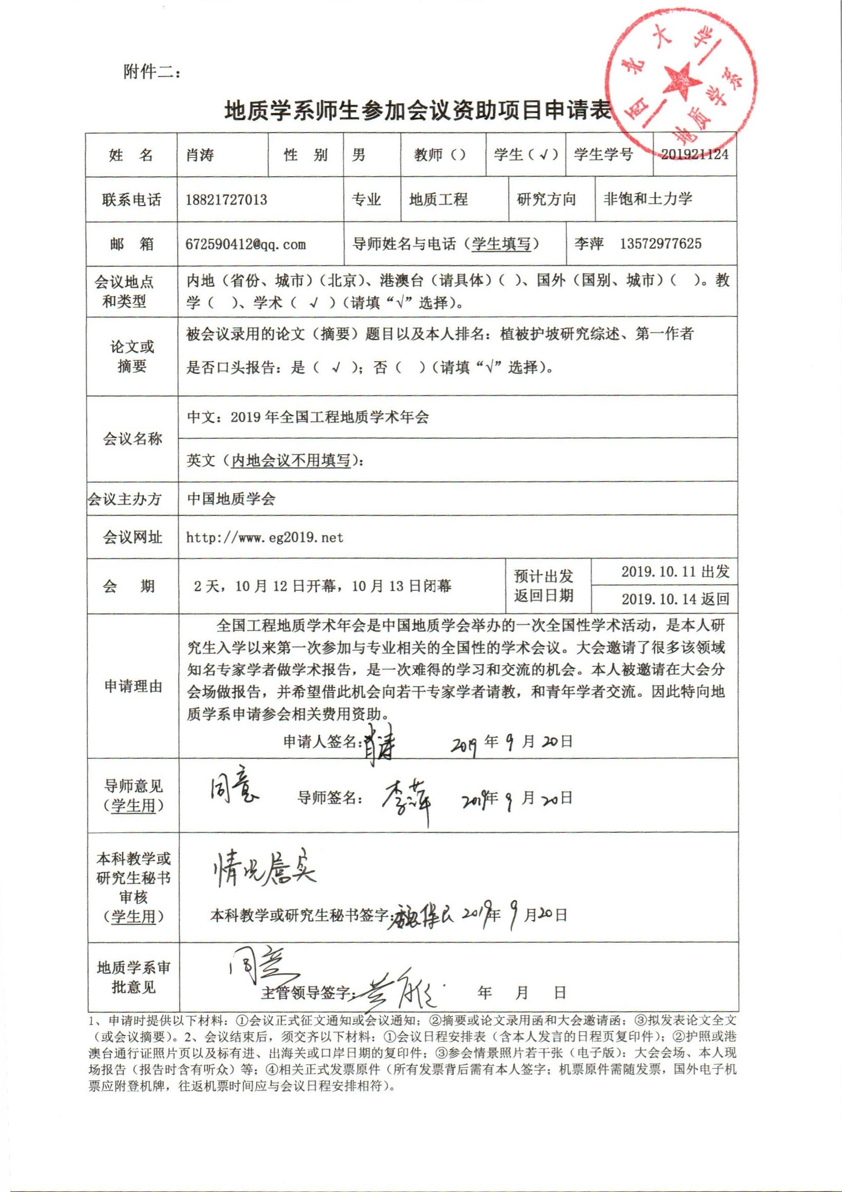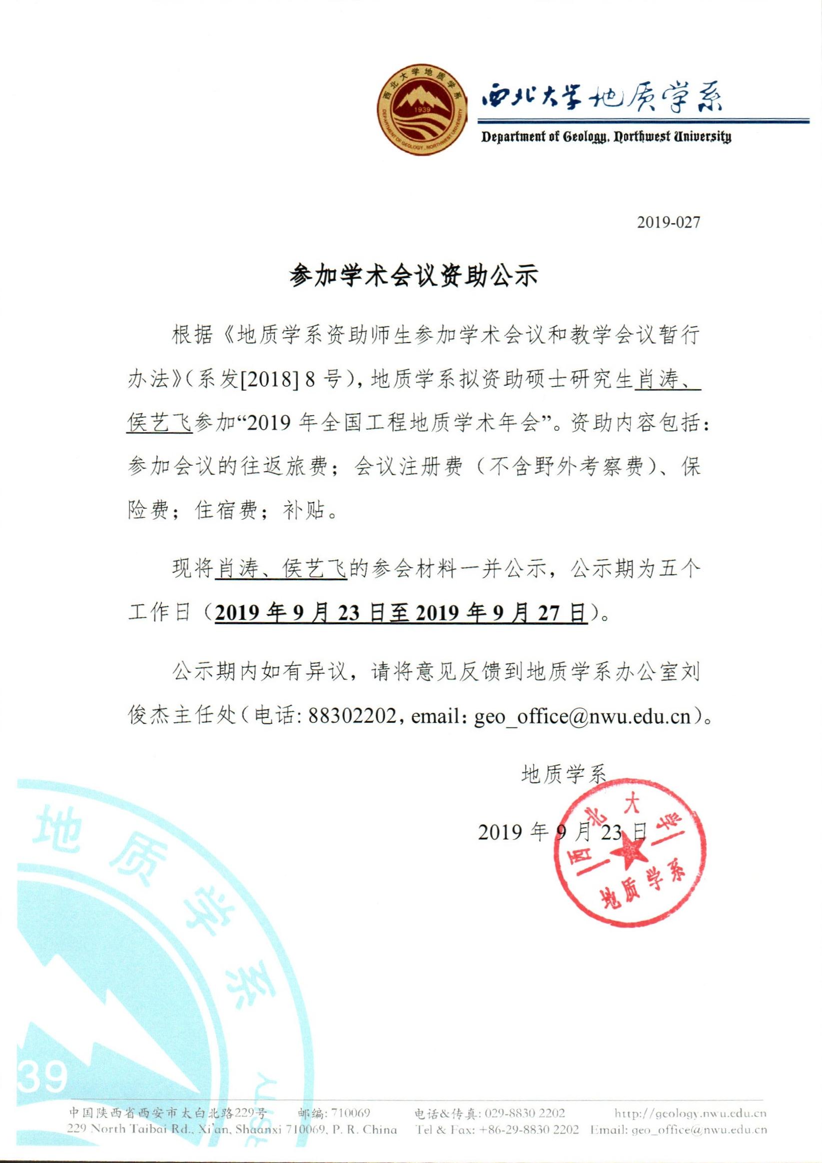 地质学系关于资助硕士研究生肖涛、侯艺飞参加学术会议的公示