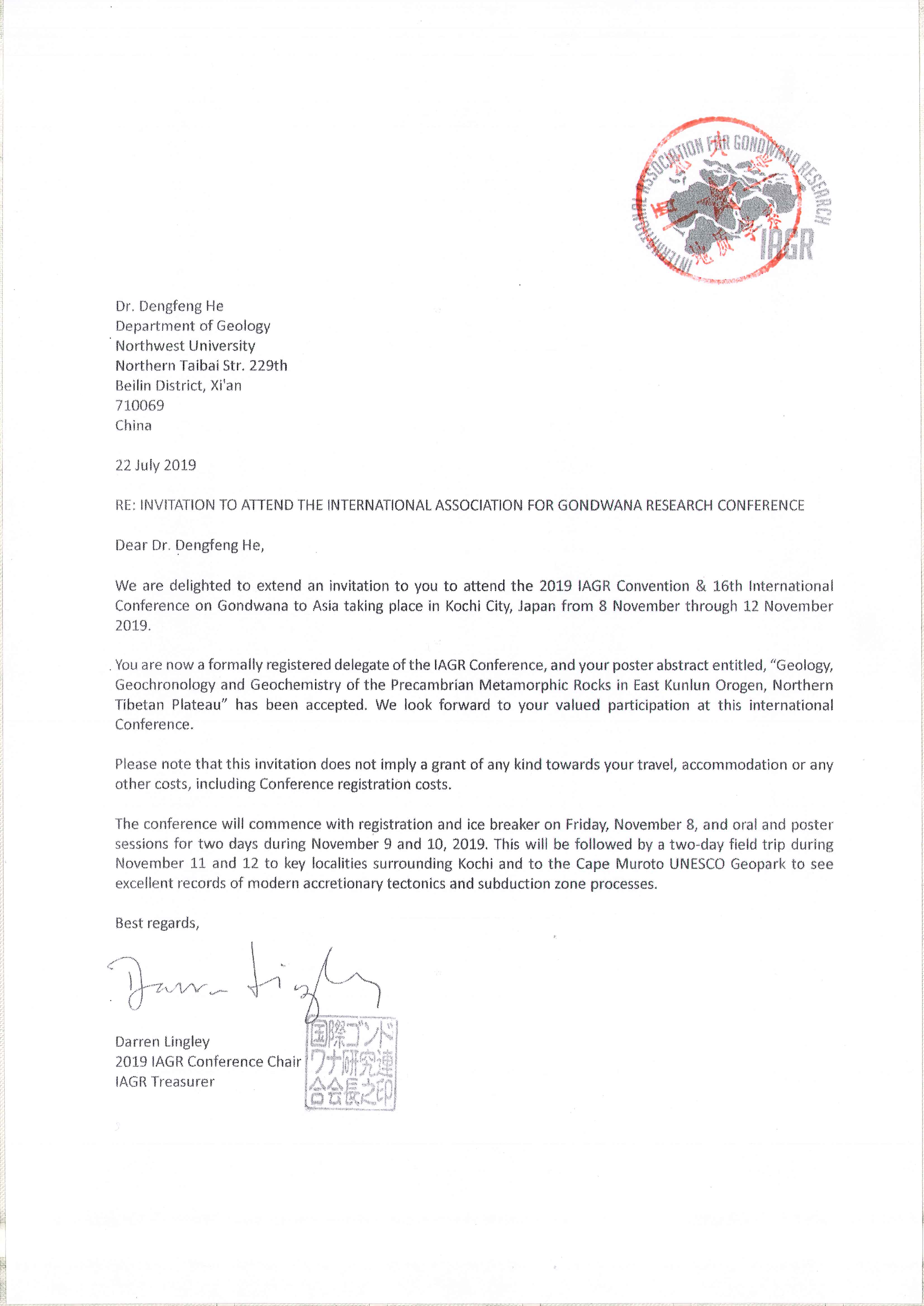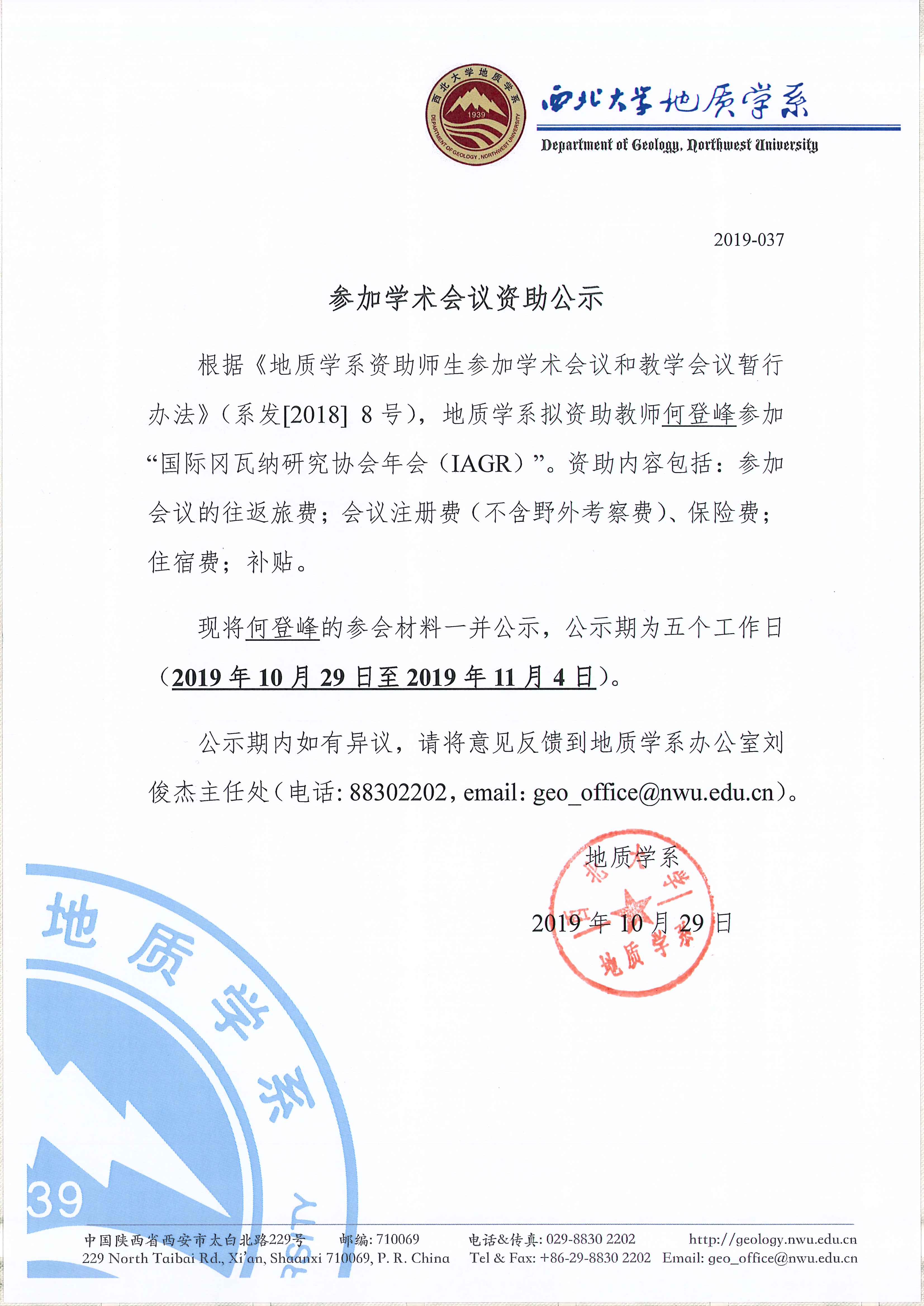 地质学系关于资助教师何登峰出国参加学术会议的公示
