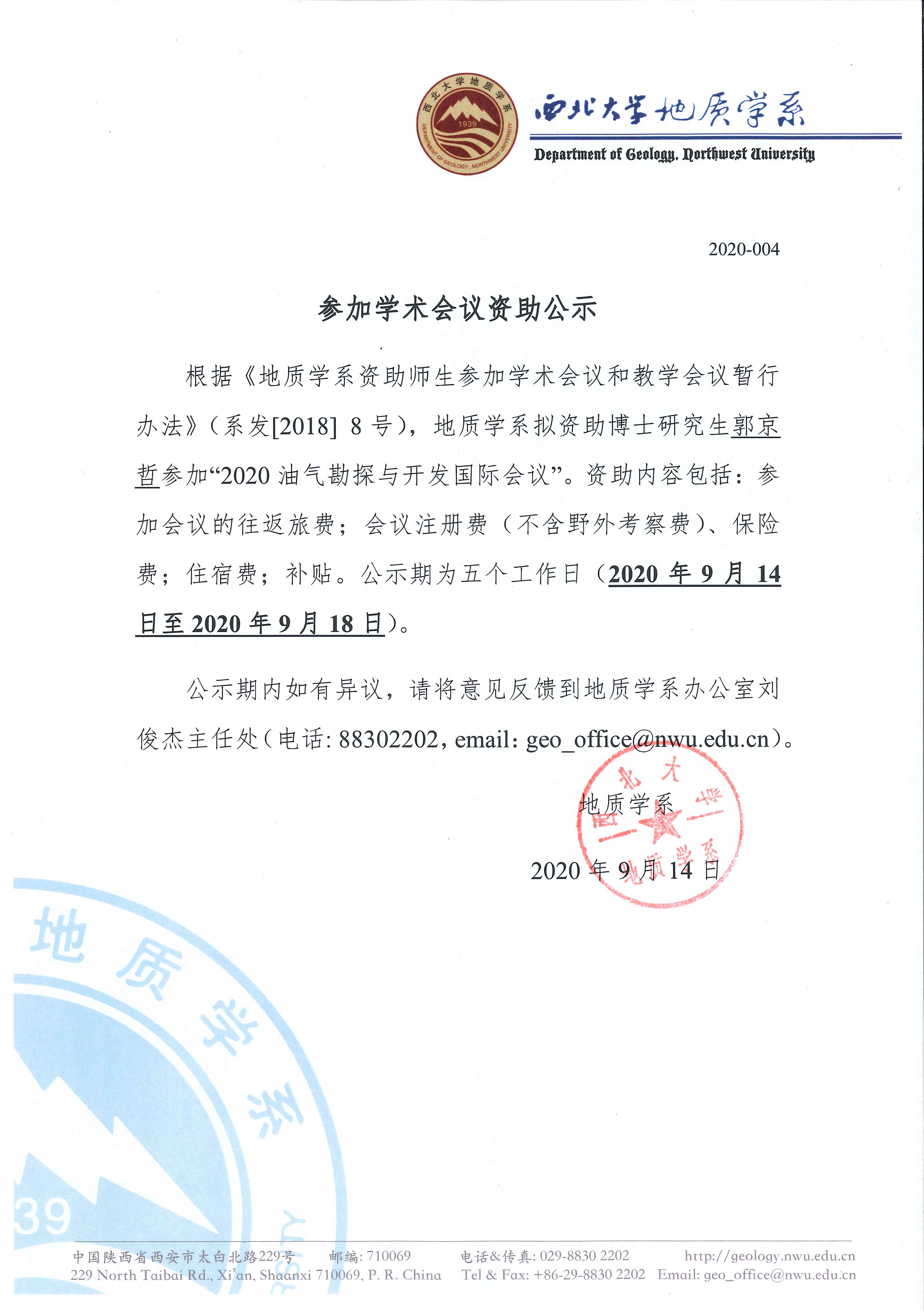 地质学系关于资助博士生郭京哲参加学术会议的公示