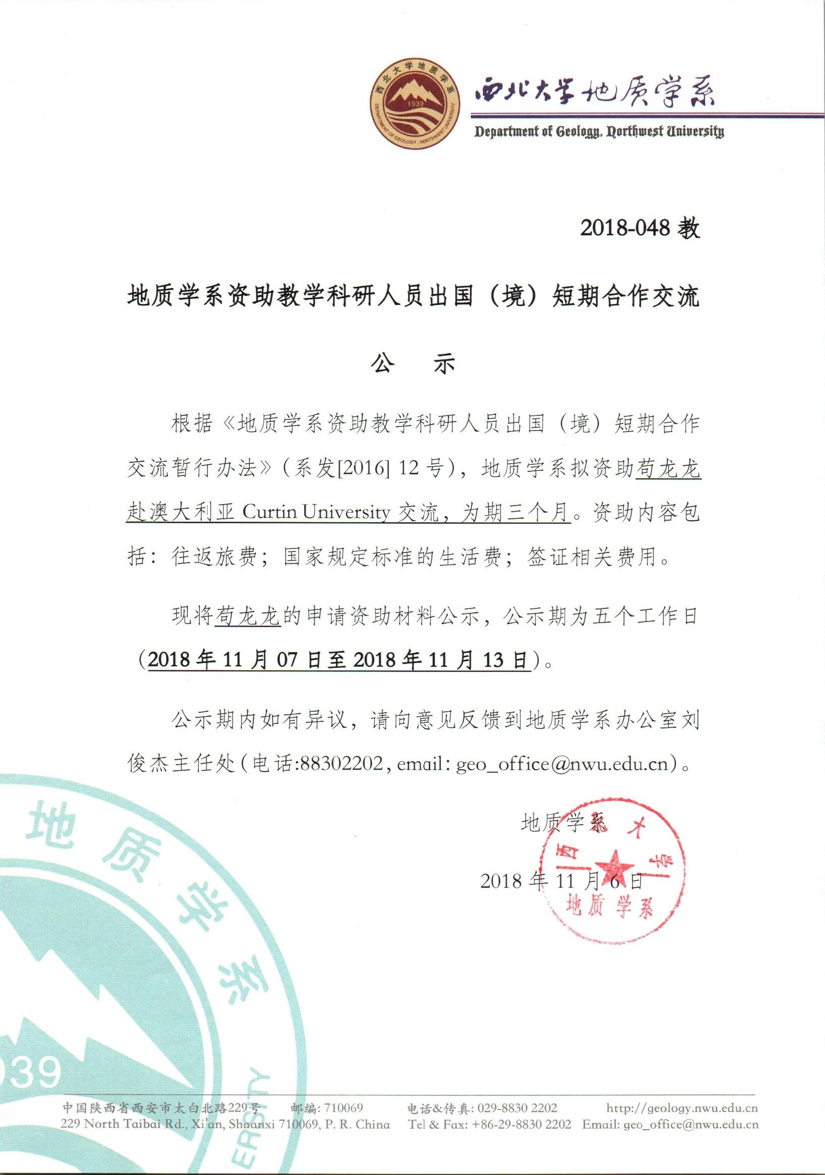 地质学系关于资助苟龙龙副教授出国短期合作交流的公示