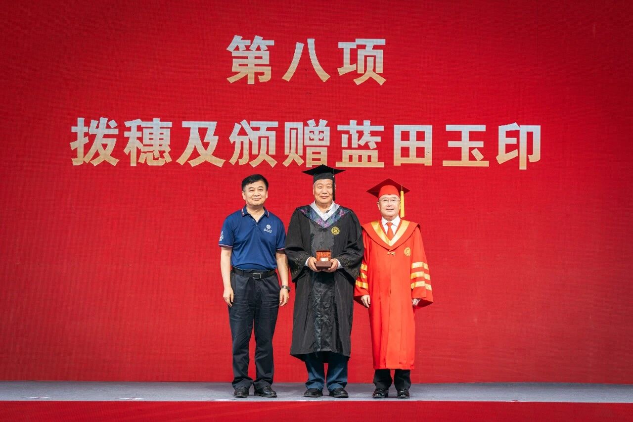地质学系1978级刘文汇作为校友代表接受校党委书记王亚杰颁赠蓝田玉印、校长郭立宏拨穗。