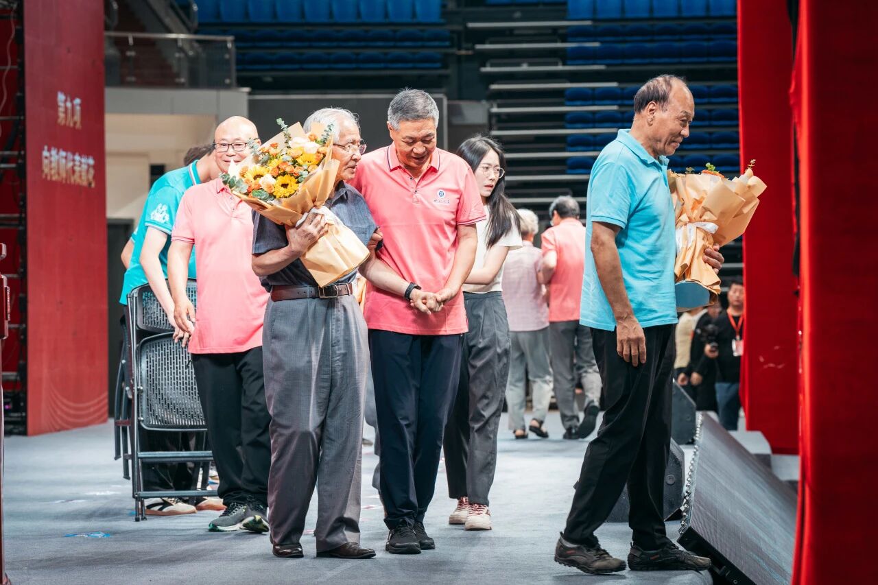 ▲1979级冯建辉为教师代表中国科学院院士张国伟教授献花