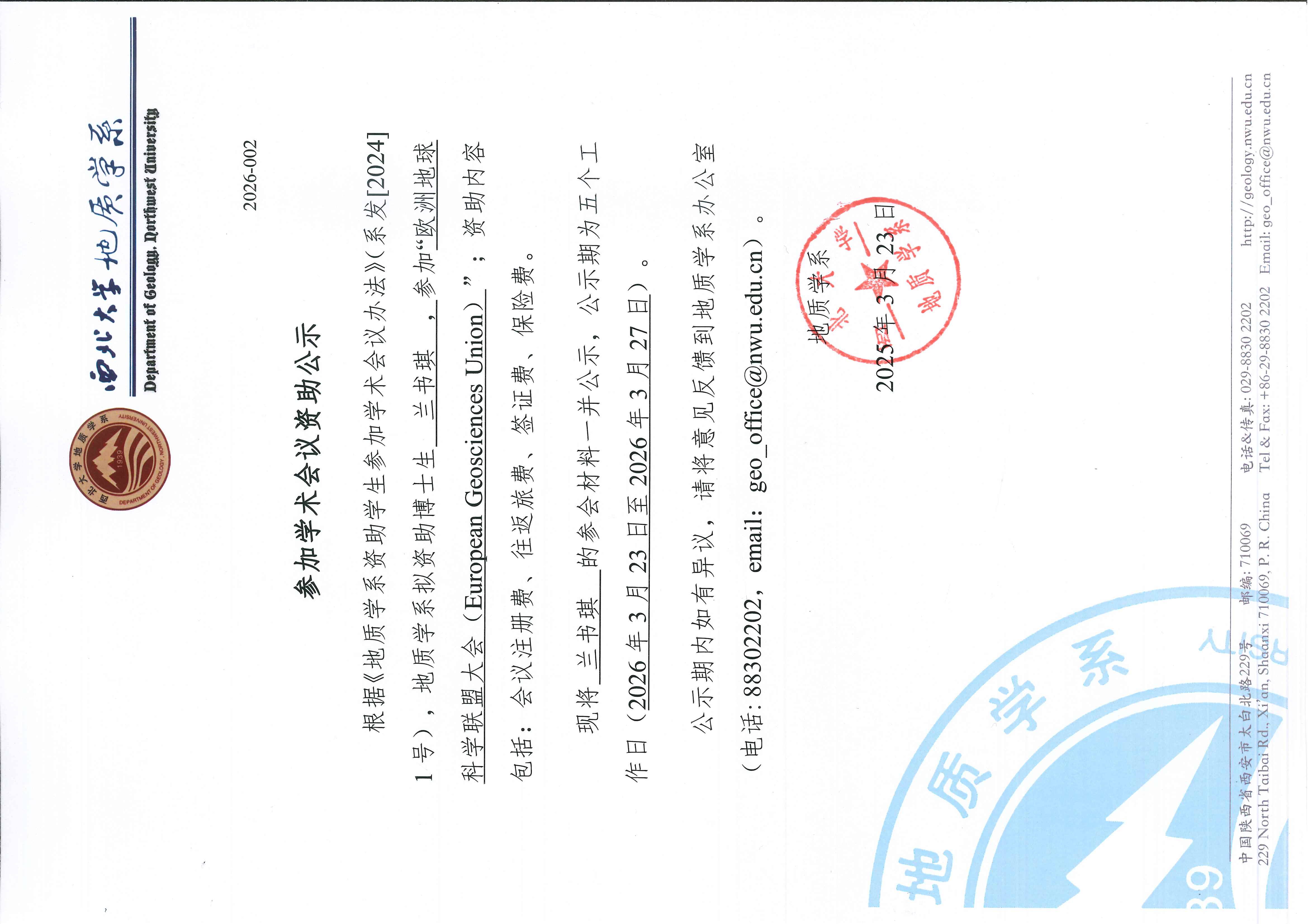 地质学系关于资助博士生兰书琪出国事宜的公示
