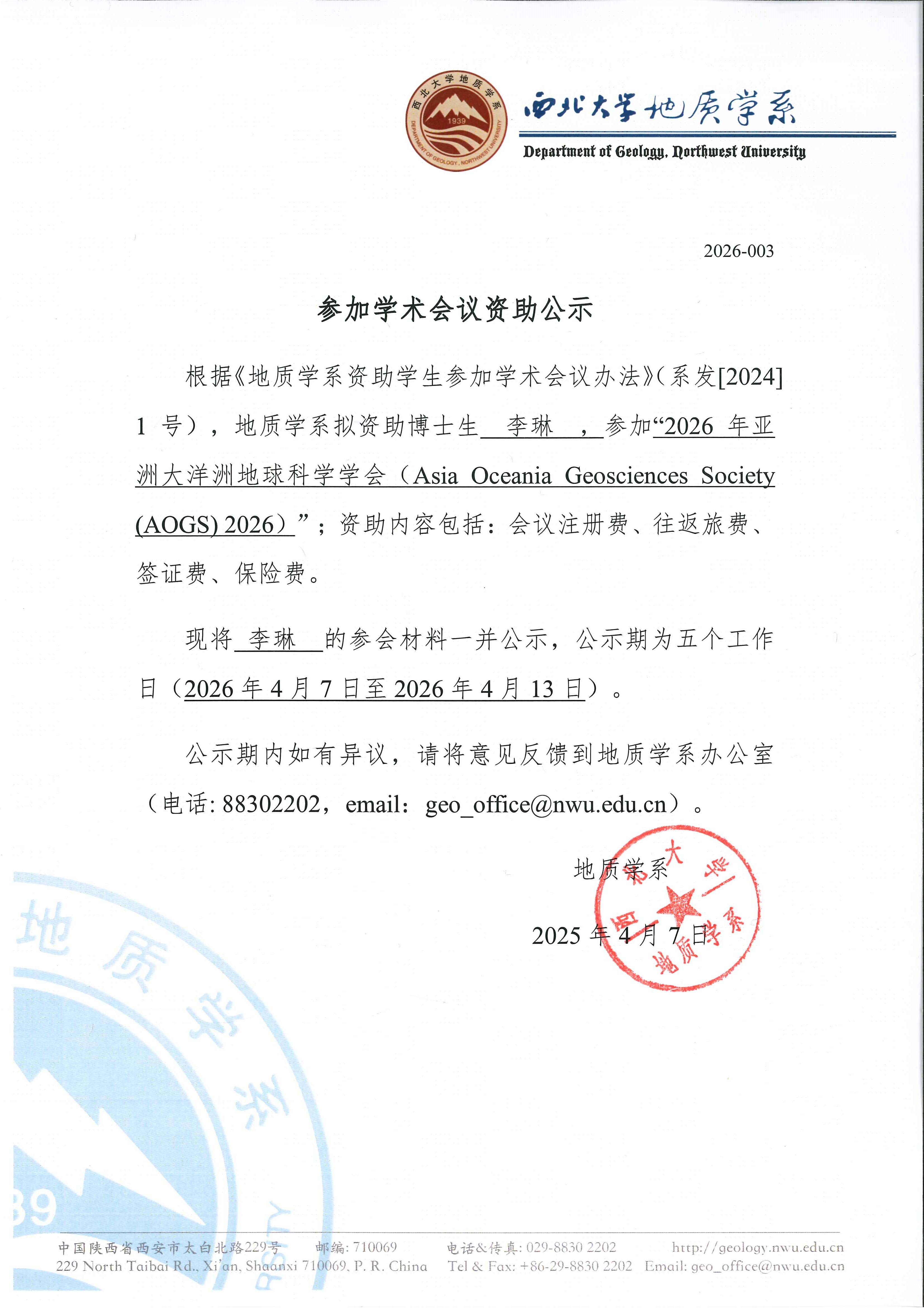 地质学系关于资助博士生李琳出国事宜的公示